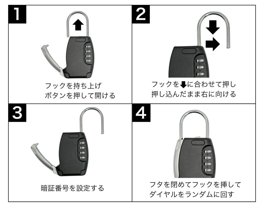 4、フタを閉めてフックを挿してダイヤルをランダムに回す