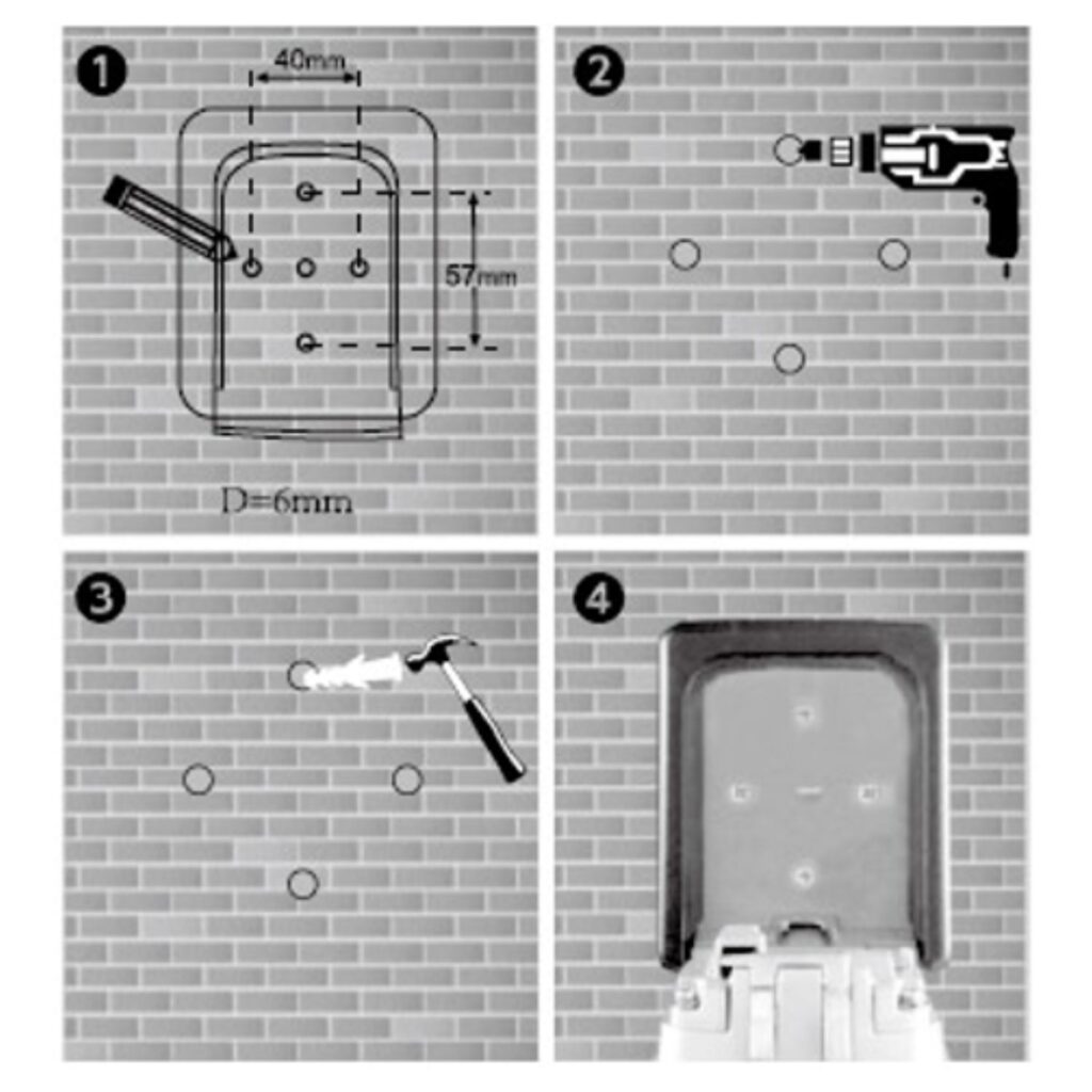 1、セキュリティボックスを開け、中に5つの穴が見えるので、中心以外の4つの穴のクッションを取り外します。そしてセキュリティボックスを壁に当ててマークを書きます。